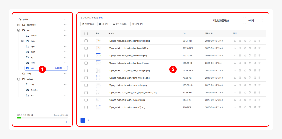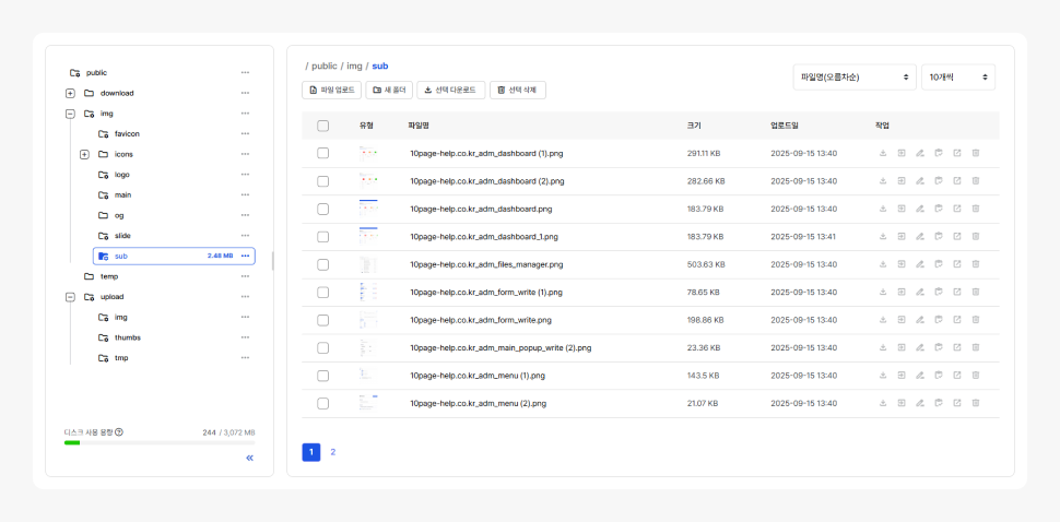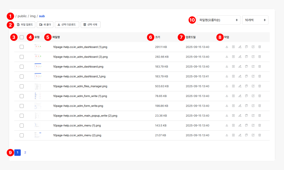 파일 관리자는 홈페이지에서 사용하는 이미지, 문서 등의 파일을 업로드하고 관리할 수 있는 기능입니다.