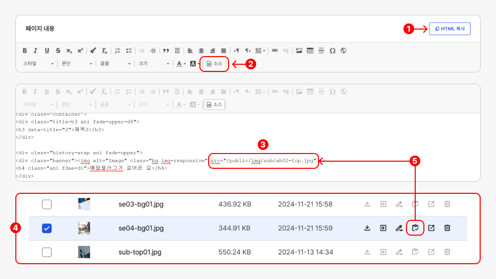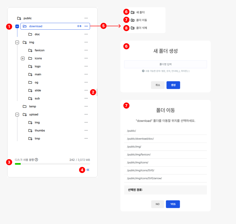 필요한 자료를 폴더별로 정리할 수 있으며, 업로드된 파일의 경로를 바로 확인하여 페이지나 게시판에 손쉽게 삽입할 수 있습니다.