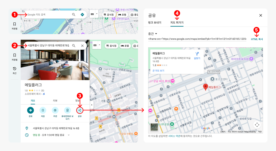 1. 구글맵에서 좌측 상단 [Google 지도 검색] 에서 주소를 검색합니다.