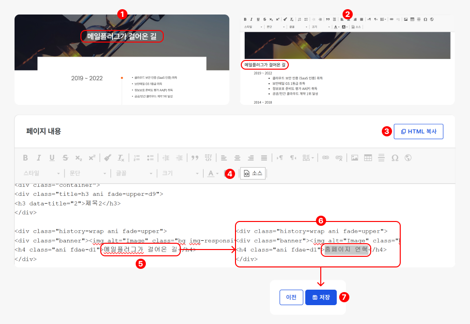 3. [HTML 복사] 버튼을 클릭해 HTML 소스를 복사하여 메모장/코드 에디터에 백업합니다.
