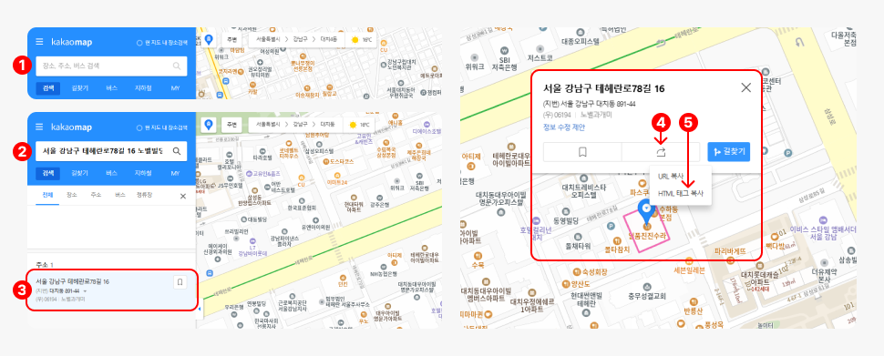 1. 카카오맵 좌측 상단 [장소, 주소, 버스 검색] 에서 주소를 검색합니다.