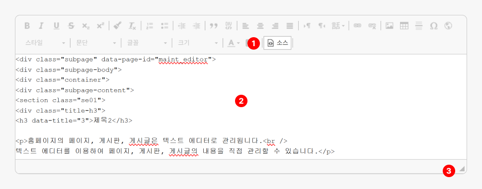 홈페이지의 페이지, 게시판, 게시글은 텍스트 에디터로 관리됩니다.